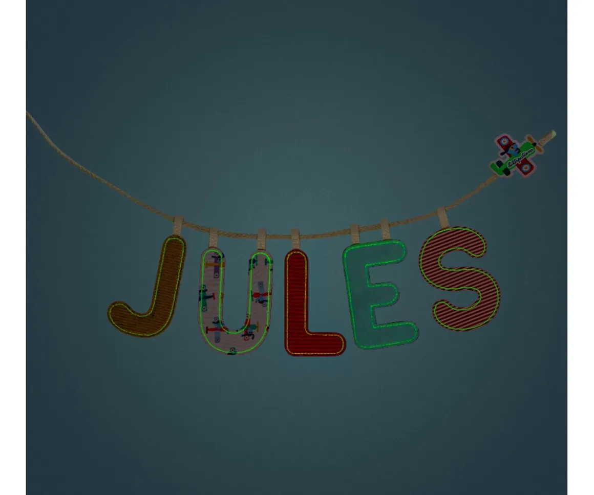 Confeccionada en un alegre color amarillo y con un suave tacto de pana, esta letra destaca por su estilo y su textura. Pero lo que realmente la hace especial es su costura fosforescente, que brilla en la oscuridad creando un ambiente mágico y acogedor durante la noche
