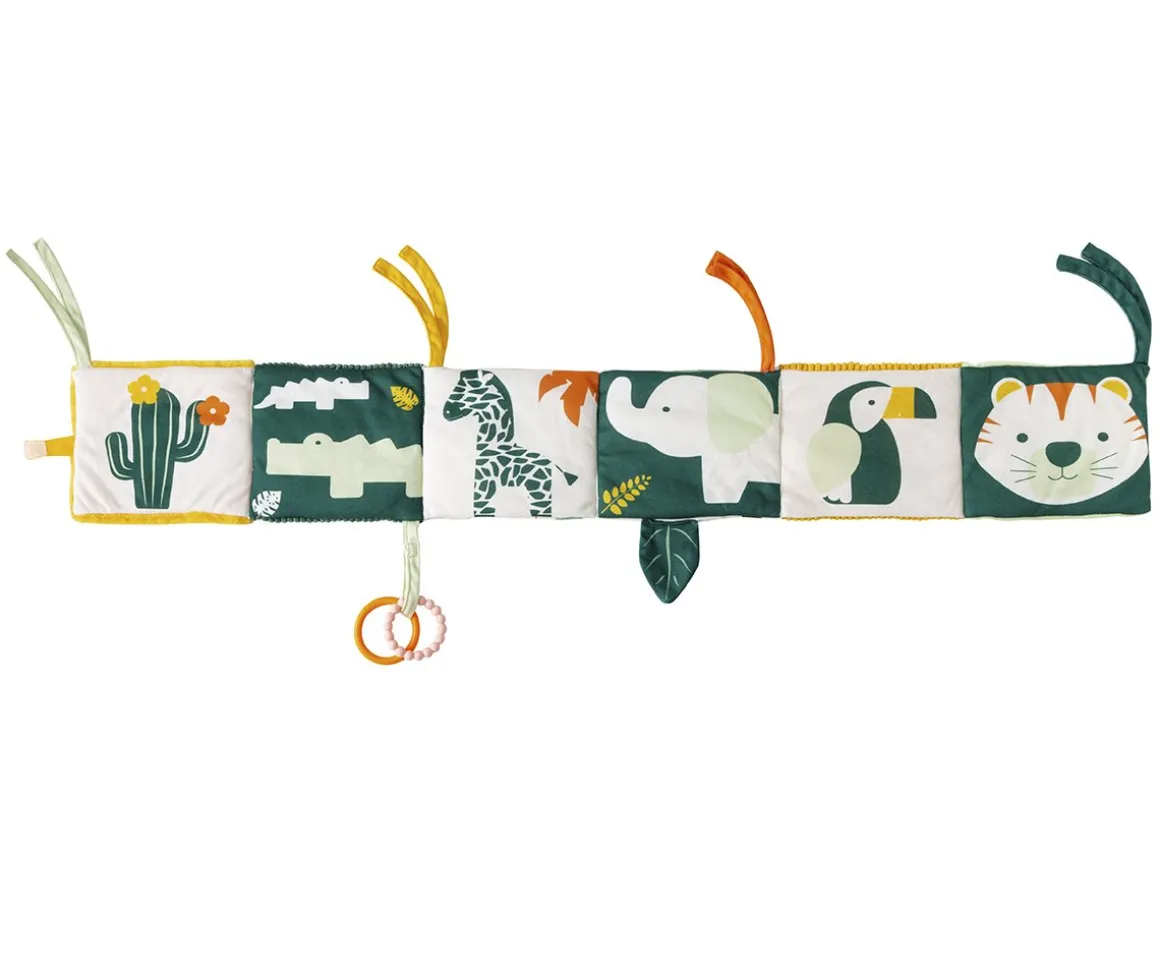 Libro de actividades 2 en 1 de Little Big Friends. Un libro blandito, con mucho color y diferentes actividades en su interior. Tiene dos lados, en el frente incluye: ilustraciones con temática de la jungla en colores y diferentes actividades. En la parte posterior: con colores verdes diferentes animales.