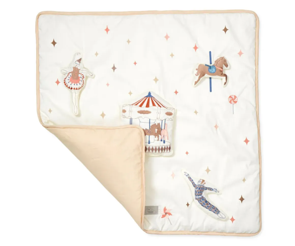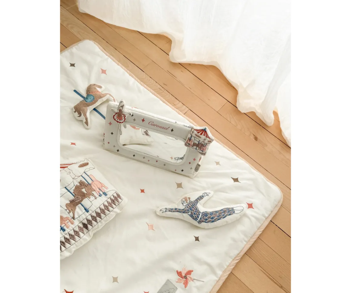 La manta de juegos de Cam Cam es el complemento perfecto para crear un rincón de juego tierno y lleno de encanto. Inspirado en la magia de los parques de atracciones clásicos, este tapete presenta un caprichoso tema de carrusel, con bordados delicados y aplicaciones cuidadas al detalle que invitan al bebé a explorar texturas, colores y formas.