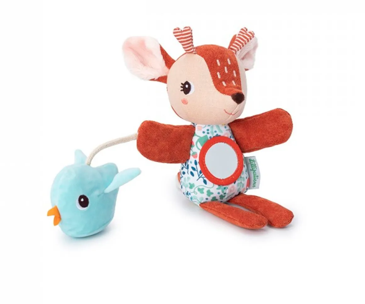 Esta preciosa y suave marioneta ¡Stella está acompañado de su amigo el pajarito, y será el pasatiempo preferido de los más peques. El pajarito suena al apretarlo, y en la cabecita de Stella hay un sonajero que suena al moverlo, despertando los sentidos de los peques.