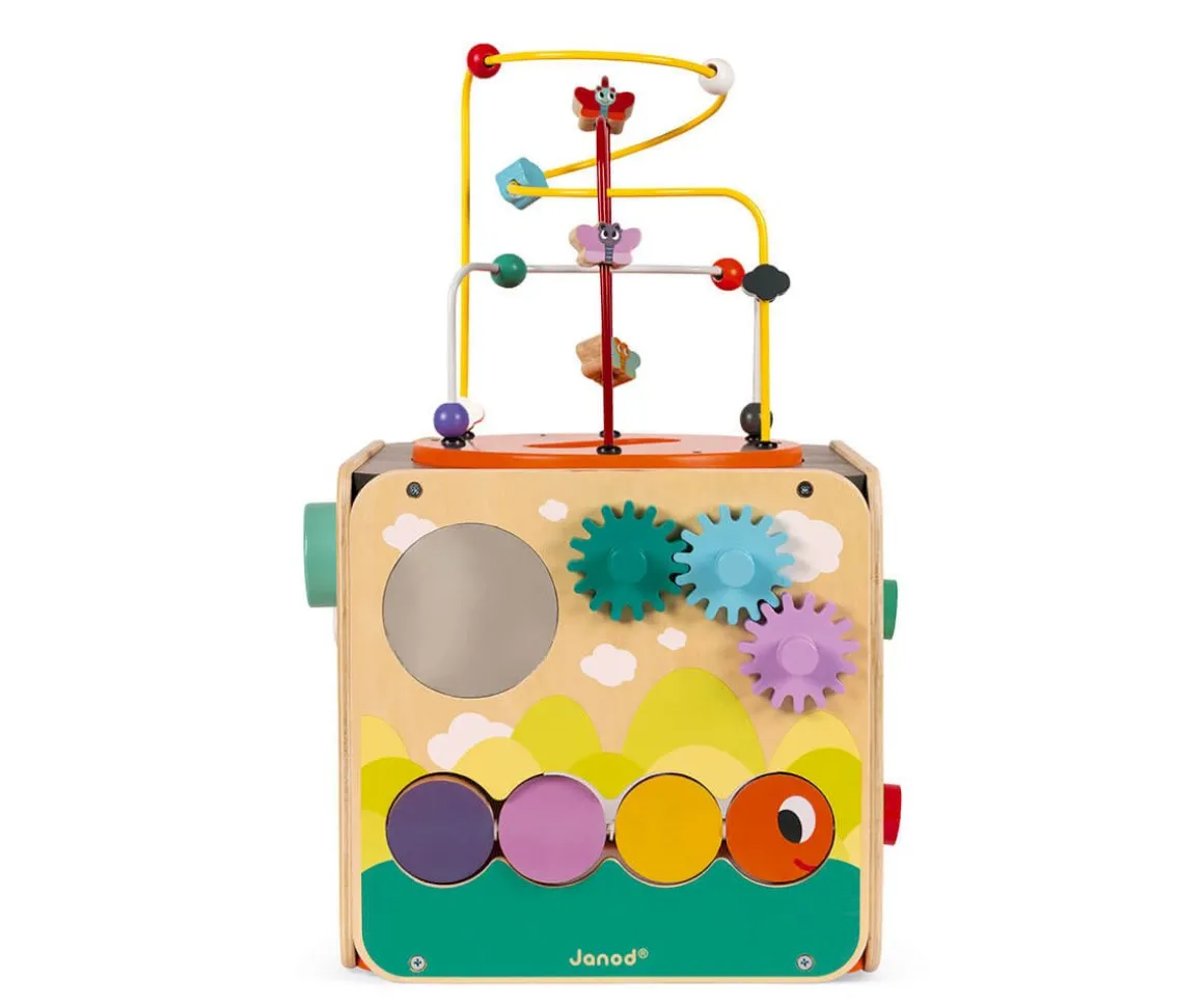 Este juguete de aprendizaje temprano está compuesto por una cara sonora con un molino lleno de huevos de madera de diferentes tamaños, otra cara con un engranaje de tres ruedas, un espejo y una oruga. Incluye también un laberinto, cinco piezas de encajar y un looping.
