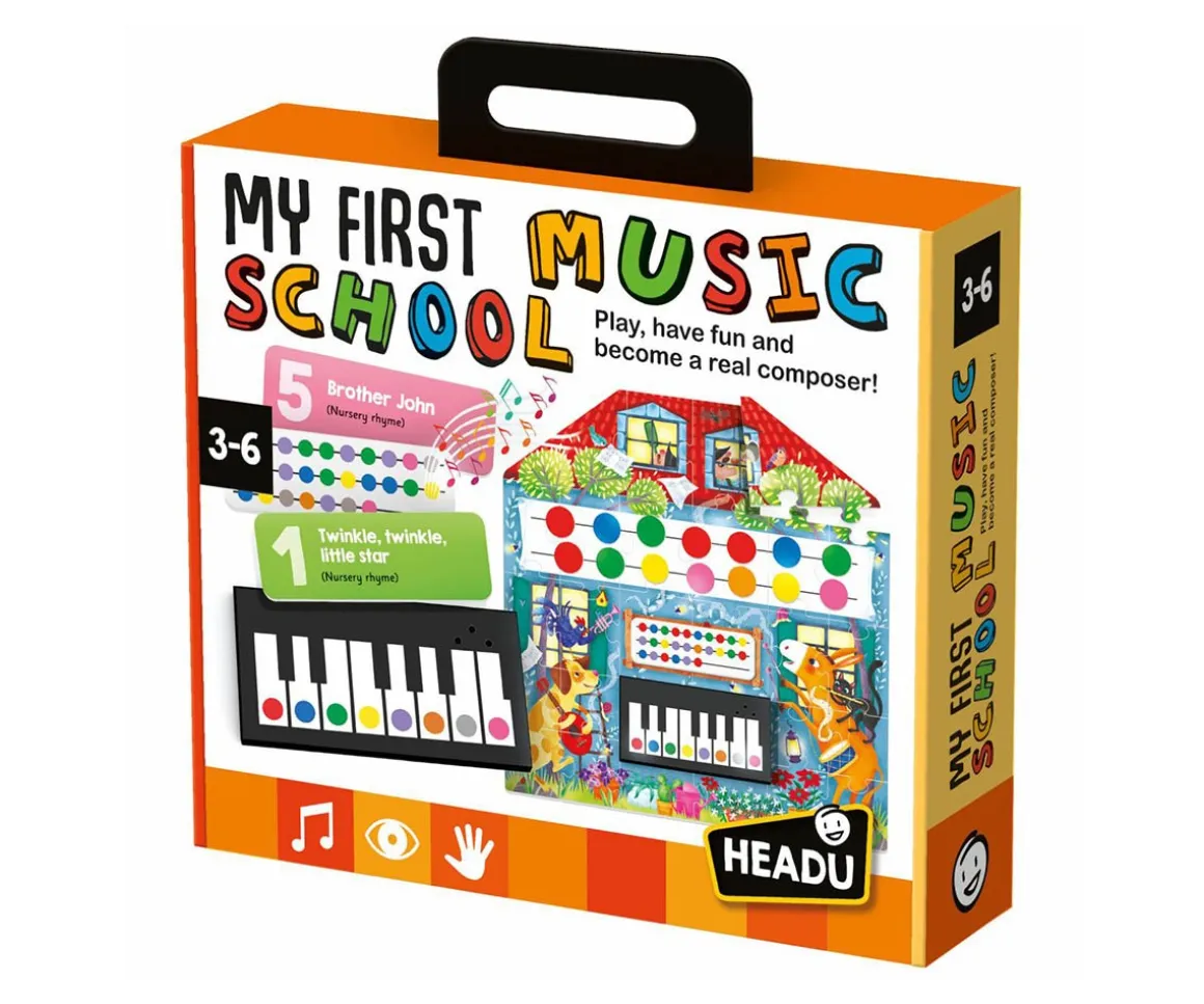 Este colorido puzzle de 26 piezas incluye un teclado central con notas de colores y 8 partituras para tocar melodías de forma sencilla. “My First Music School” es ideal para introducir a los más pequeños en el mundo musical, mientras estimulan su coordinación, memoria y desarrollo cognitivo de manera divertida y creativa.