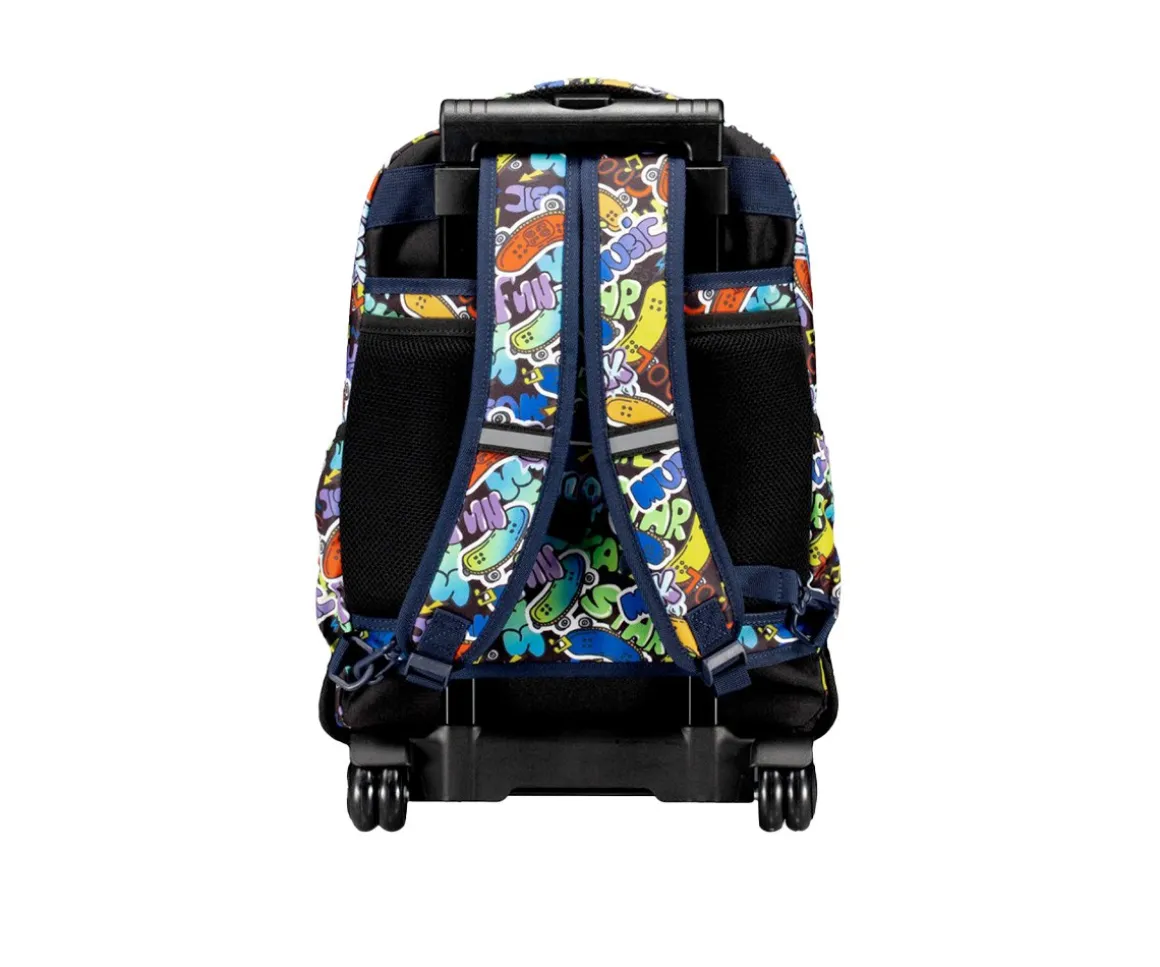 Su diseño con carro integrado, doble barra y tirantes acolchados la hace muy versátil, perfecta tanto para llevarla rodando como a la espalda. Cuenta con dos compartimentos principales de gran tamaño, su base es rígida y resistente, protegiendo el contenido contra golpes, mientras que los dos bolsillos laterales permiten llevar botellas de agua de forma segura.