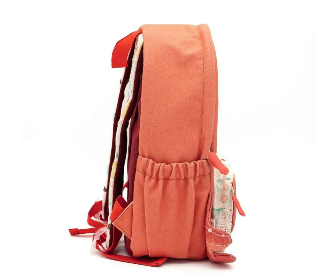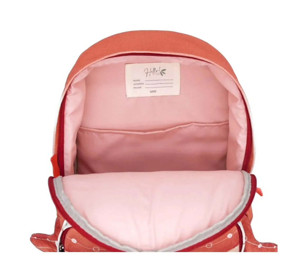 La mochila escolar Sassi cuenta con bolsillos exteriores para la botella de agua, un bolsillo interior para objetos más pequeños y una etiqueta en el interior para escribir el nombre.