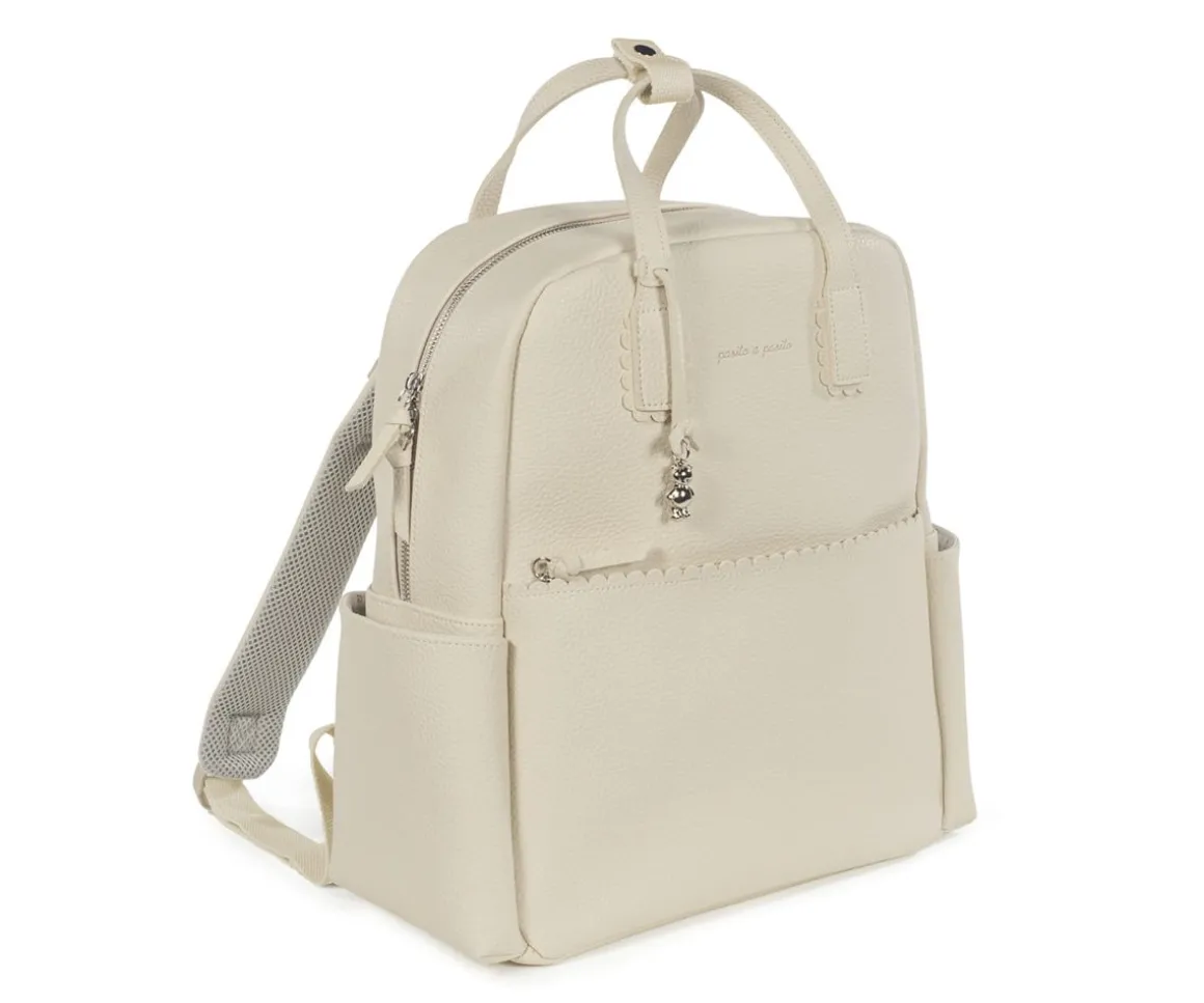 Mochila Icon Cream de Pasito a Pasito, es ideal para llevar todo lo necesario durante el paseo del bebé. Su resistente y delicada polipiel lo hace ligero y duradero, con amplio compartimento principal espacioso, bolsillo interior térmico para biberones, bolsillo plastificado y bolsillo para cambiador.