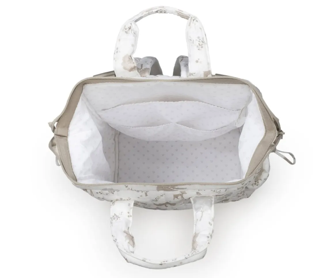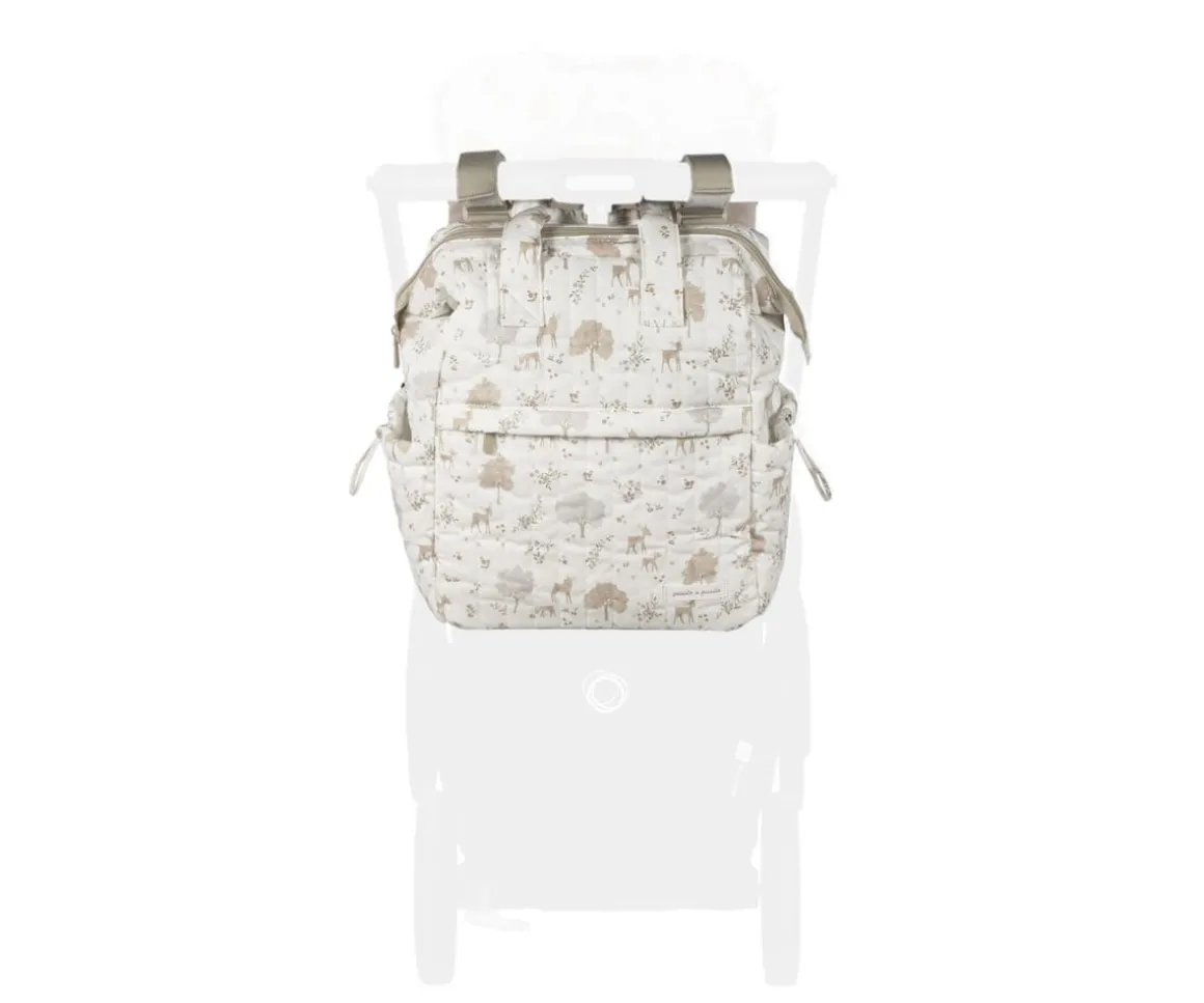 Mochila de la colección Nara de Pasito a Pasito, elaborado en loneta de algodón 100% de gran capacidad para llevar todo lo que necesitas tu y tu bebé. Su adorable estampado de ciervos y árboles quedará ideal en el carrito de tu peque.