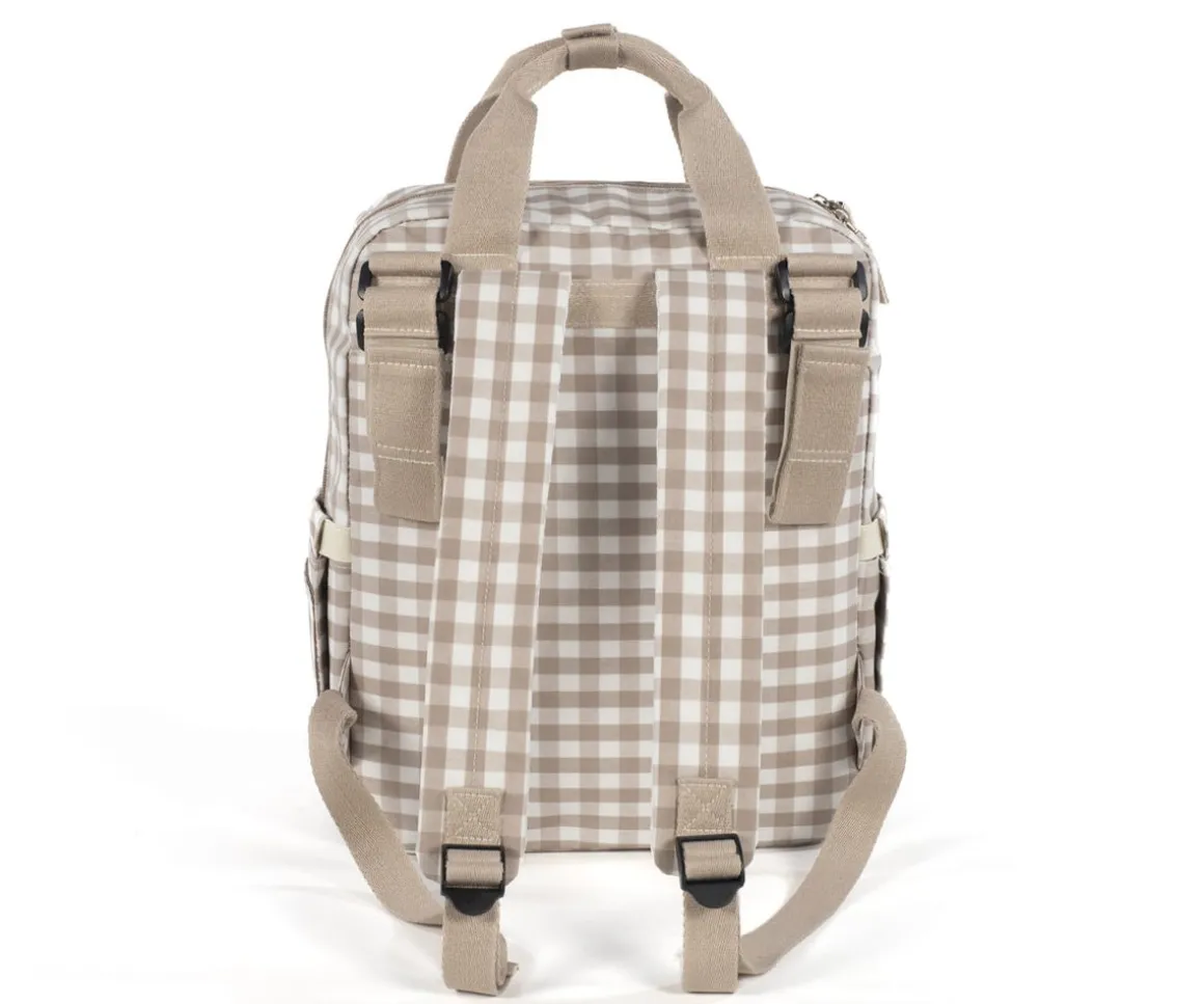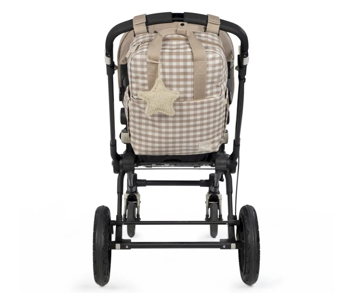 Mochila que además es una bolsa canastilla muy ligera, resistente y de gran capacidad de la colección Caetana cuadros vichy en color Sand de Walking Mum, para llevar todo lo necesario para el paseo del bebé. El bolso incluye 2 asas cortas ajustables que facilitan la colocación en cualquier modelo de silla de paseo, asas de mano y correas acolchadas para colgar en la espalda y llevarla contigo cómodamente.