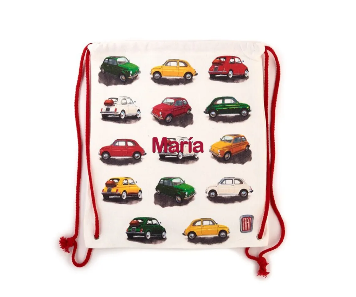 Mochila saco de Puckator con diseño de coches Fiat 500. Perfecta para llevar la merienda, el almuerzo o una muda al cole o de excursión.