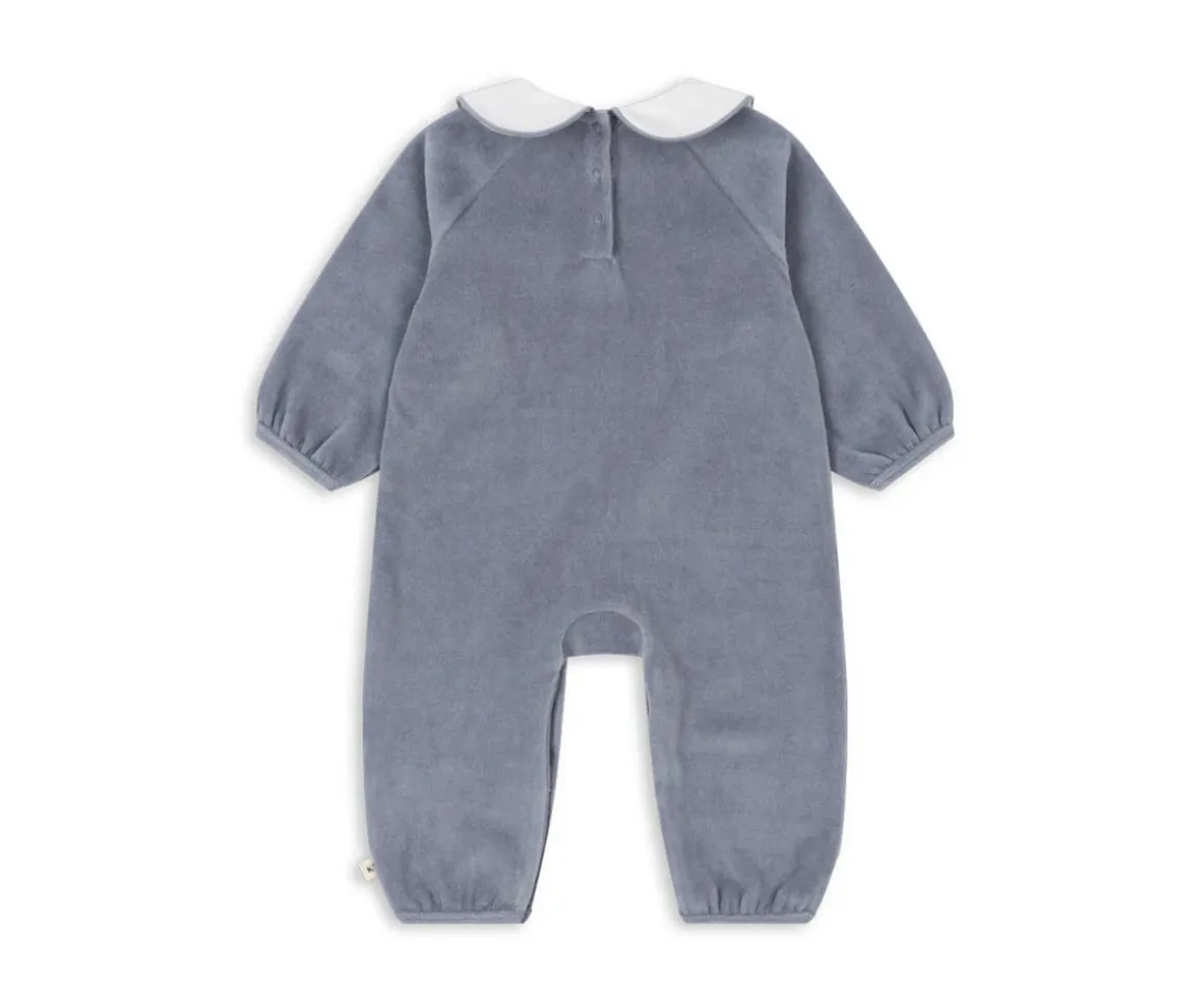 Tu peque irá bien arropadito con el mono de terciopelo suave con cuello y bordado en el pecho con un bonito osito de Konges Slojd.