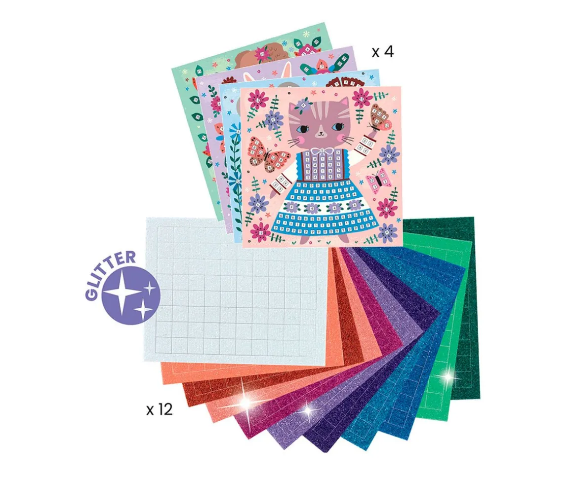- Incluye : : 4 tarjetas ilustradas, 12 planchas de cuadrados de espuma autoadhesiva metalizada, 1 folleto con instrucciones paso a paso a todo color