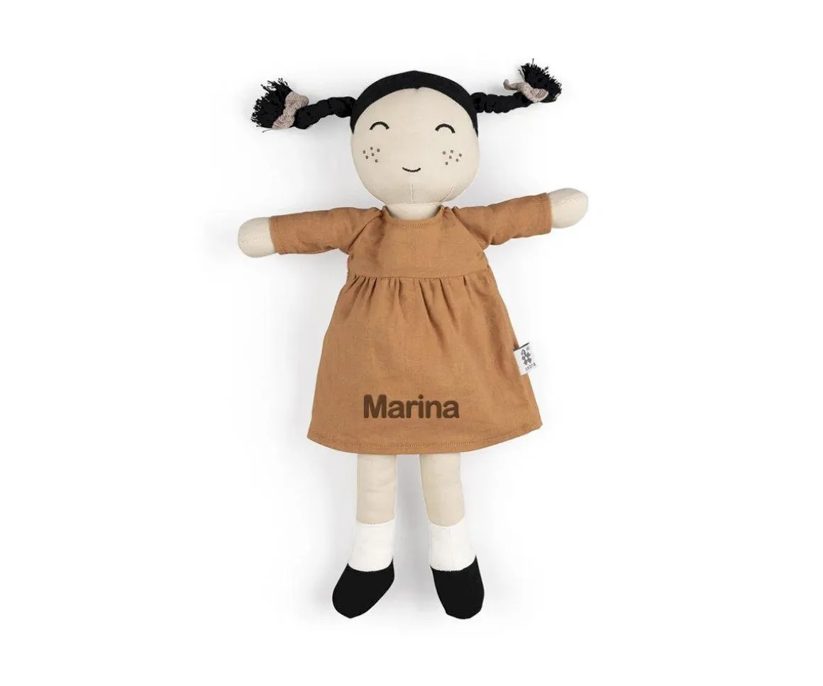 Conoce a Li, una adorable muñeca de tela de 43 cm. Su cuerpo y vestido están fabricados en algodón y lino, con su cabello cosido negro y dos trenzas con detalle de un lazo tejido a crochet. Su vestido es desmontable y además, puedes personalizarla con el nombre del peque, haciendo de Li un regalo único y especial.