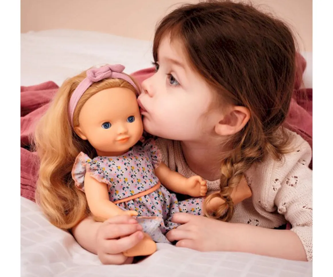 Marie viste un bonito vestido de motivos florales, unos zapatos muy conjuntados y una banda para recoger su larga melena rubia. Tiene unos preciosos ojos azules que se abren y cierran cuando la muñeca esta en vertical o en horizontal. Además, tiene su cuerpo totalmente articulado y fabricado en vinilo, para aportar suavidad y facilitar su limpieza.