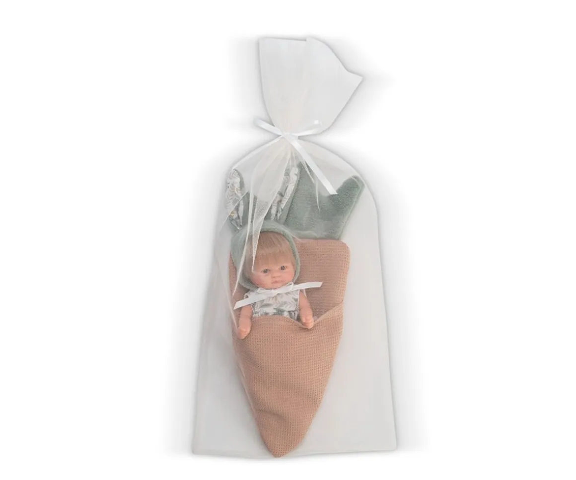 Bomboncín lleva puesto un look muy original formado por una pelele con gorrito de orejitas de conejo, y un saco con forma de zanahoria para que lo puedas arropar. Un compañero de aventuras y juegos ideal para que lo lleves a todas partes.
