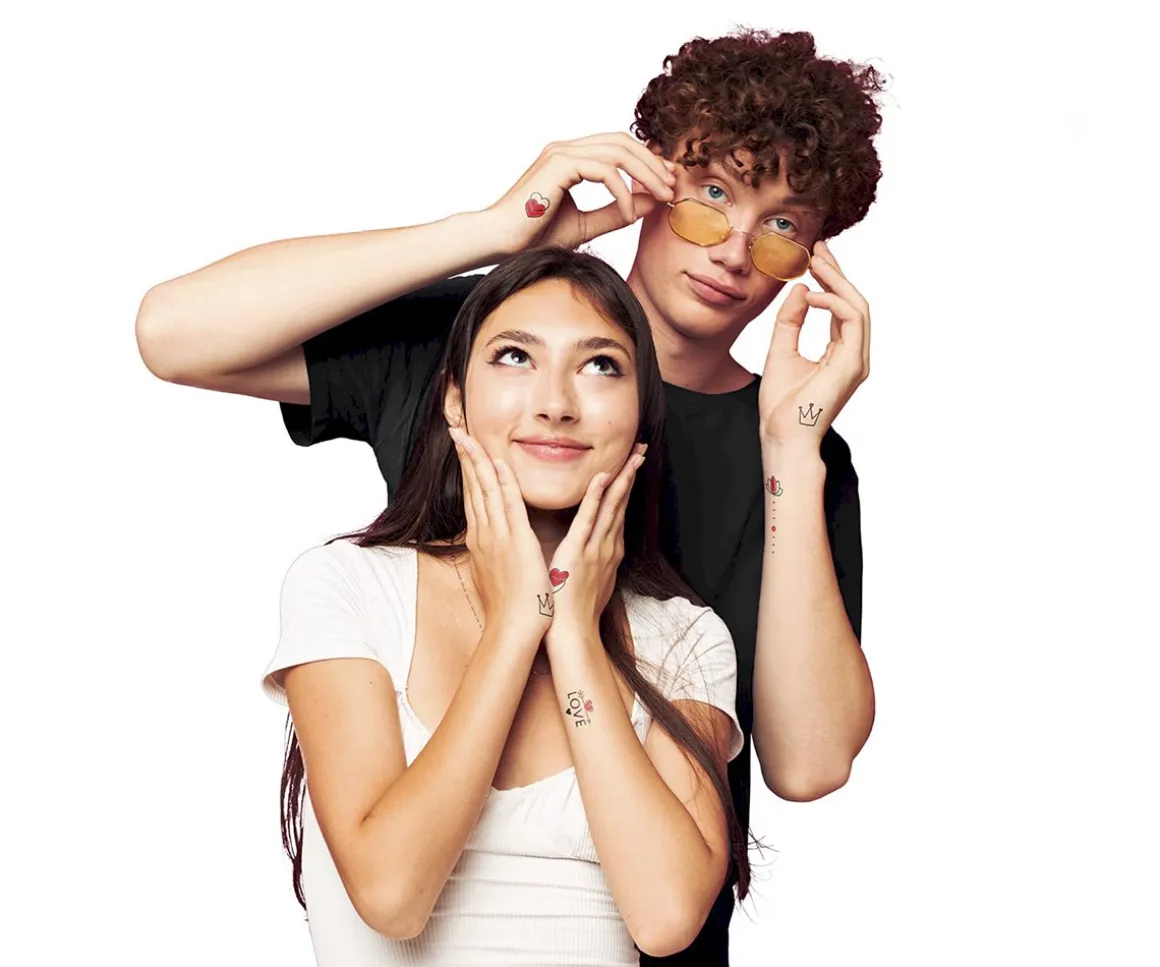 Kit de tatuaje temporal con sellos de dibujos modernos para tattoos. Dibuja en tu piel divertidos motivos de amistad. Los peques podrán usarlos en cara y cuerpo y son fáciles de limpiar, basta con un poco de aceite de bebé o desmaquillante.