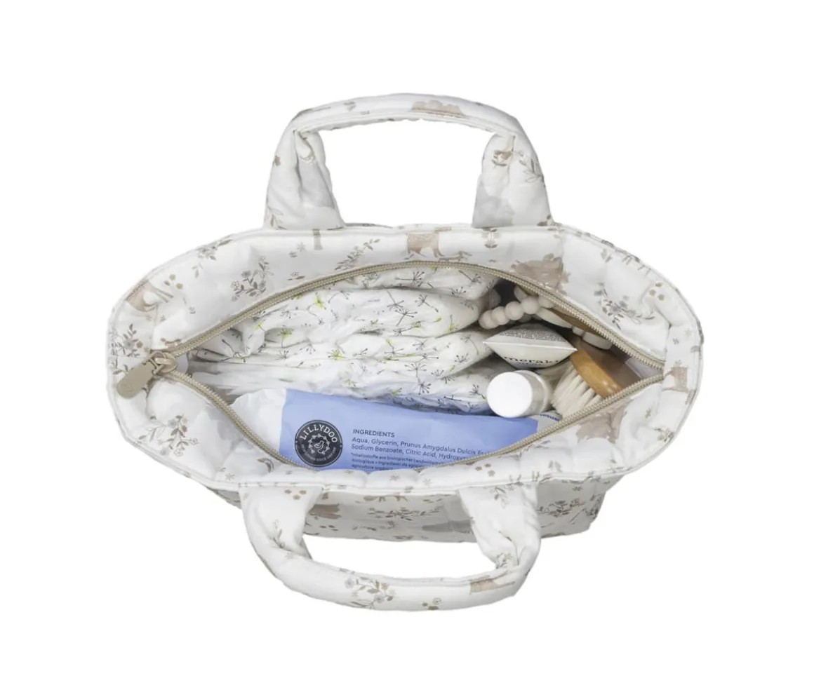 Es un diseño bonito, simple y cómodo que ofrece un espacio pequeño pero preciso para llevar justo lo que necesitas para la higiene de tu bebé, peine, lociones y otros objetos que por ser tan pequeños a veces se pierden dentro del bolso canastilla. Cuenta con un cierre de cremallera de fácil apertura.