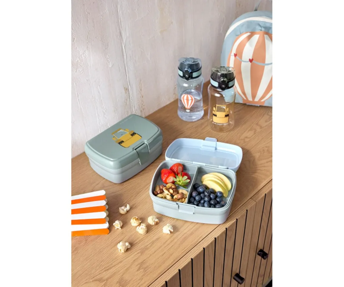 La fiambrera tiene un compartimento extraíble para meter distintos snacks: en la bandeja superior hay espacio para frutas y alimentos más pequeños, mientras que el compartimento inferior no está dividido y ofrece suficiente espacio para sándwiches y bocatas. La botella viene a juego y es perfecta para llevar agua o zumos.