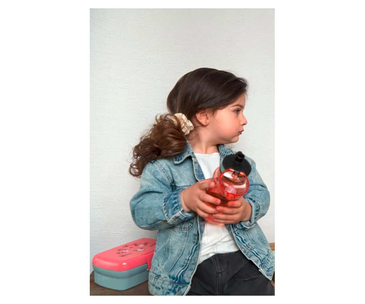 La fiambrera tiene un compartimento extraíble para meter distintos snacks: en la bandeja superior hay espacio para frutas y alimentos más pequeños, mientras que el compartimento inferior no está dividido y ofrece suficiente espacio para sándwiches y bocatas. La botella viene a juego y es perfecta para llevar agua o zumos.
