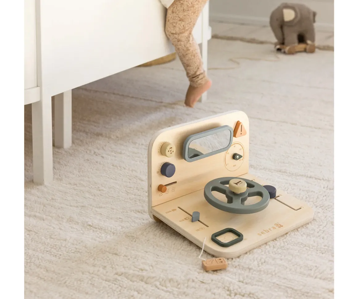 El panel de actividades coche de madera Sebra ofrece a los pequeños amantes de los vehículos una experiencia de juego única, llena de imaginación, movimiento y aprendizaje. Fabricado en madera certificada de alta calidad, este tablero reproduce los detalles de un coche real con un encantador estilo nórdico.