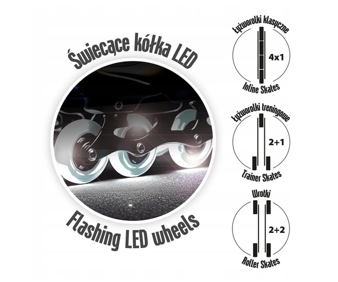 - Ruedas LED PU 82A (64×24 mm) que amortiguan impactos y se iluminan al rodar sin pilas