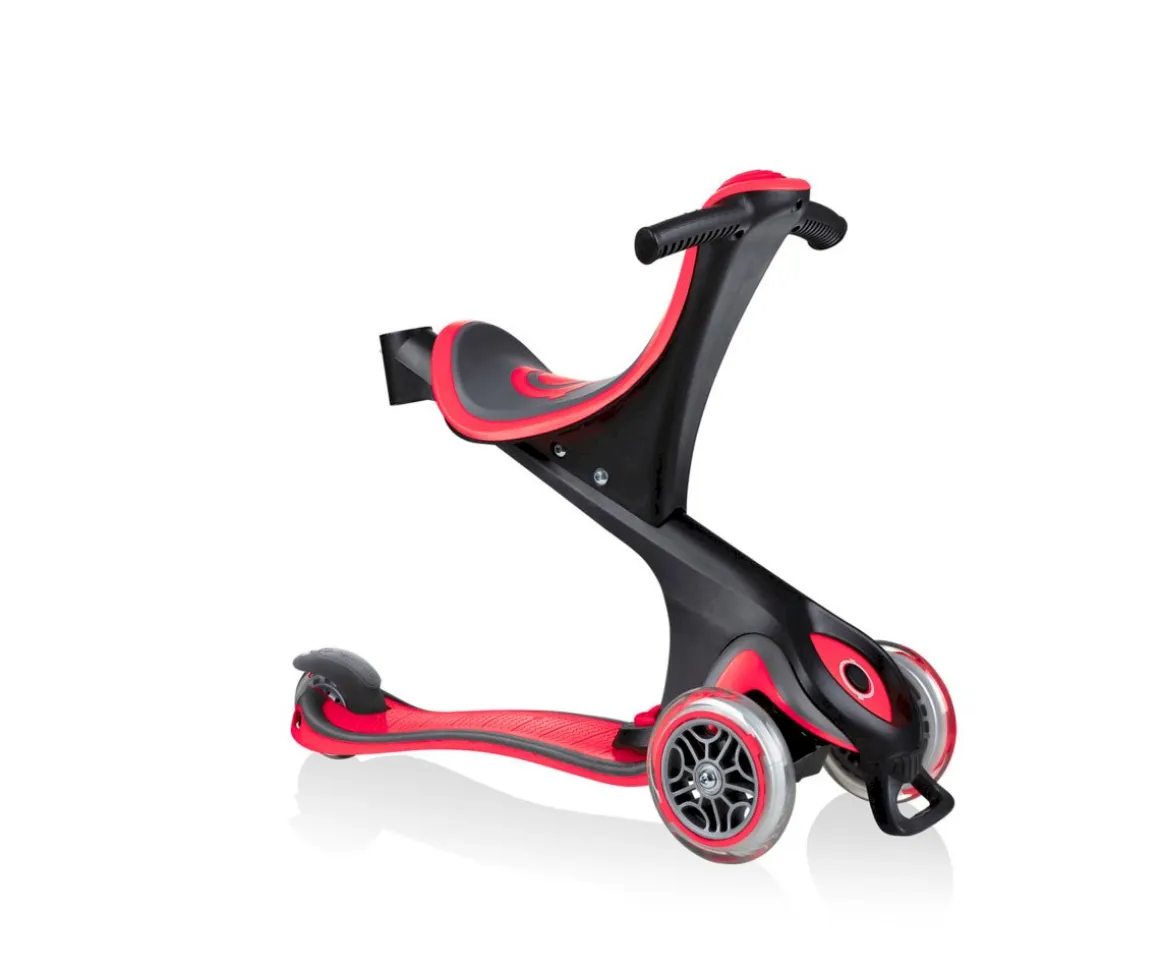 Se transforma en una bicicleta para caminar acompañado, una bicicleta para caminar y un scooter para niños pequeños. Incluye un sistema de bloqueo de dirección patentado por Globber que fija las ruedas delanteras en un movimiento vertical de vaivén que ayuda a los peques a mejorar el equilibrio.