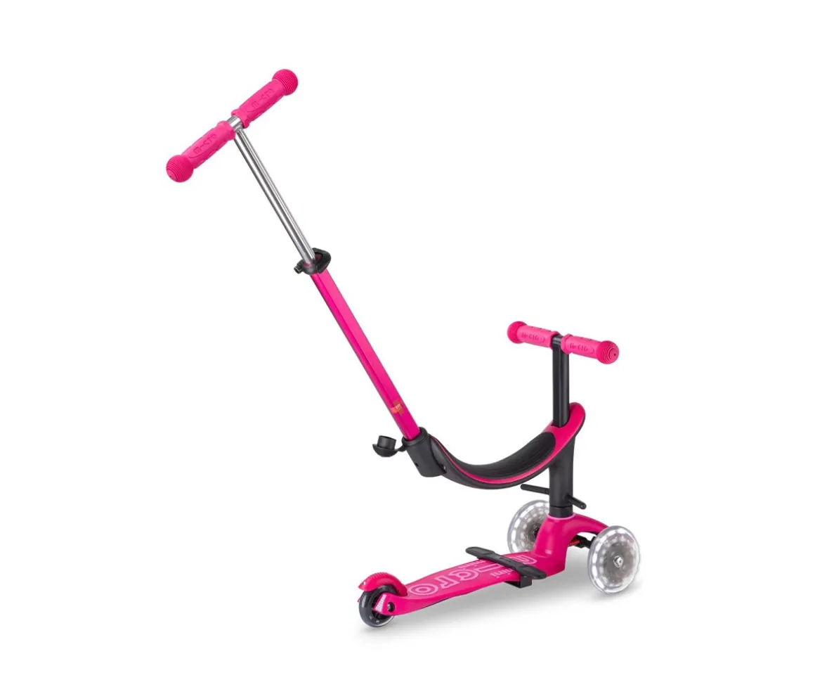 El Micro Mini2Grow es el compañero perfecto para los peques desde los 12 meses. Se puede utilizar en diferentes variantes: con asiento, dos opciones de reposapiés y barra de empuje para los padres y sin barra de empuje, como una mezcla entre bicicleta de equilibrio y patinete, y finalmente como un Mini Micro Deluxe clásico.