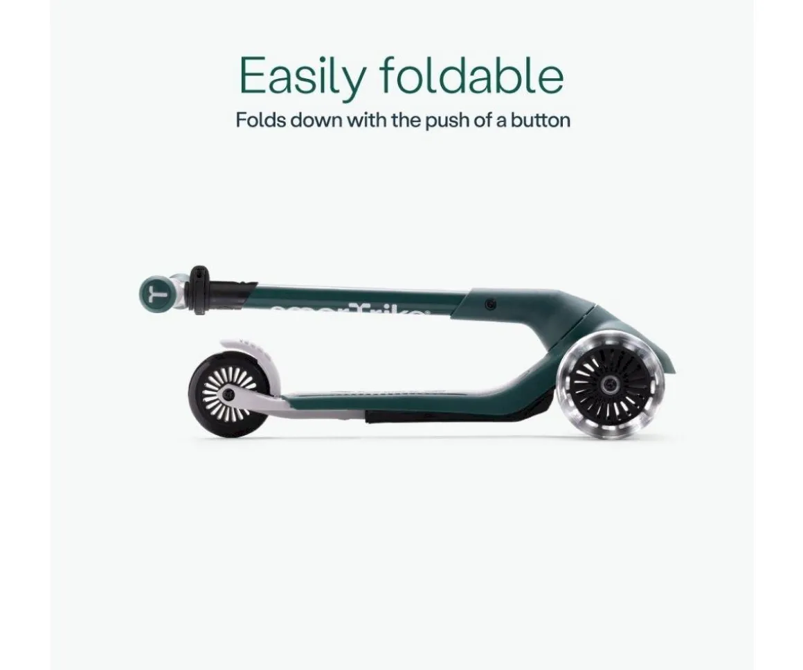 Su plegado es ultra rápido: ¡solo presiona un botón y listo! Además, sus ruedas LED brillan en la oscuridad, haciendo que cada paseo sea aún más divertido.