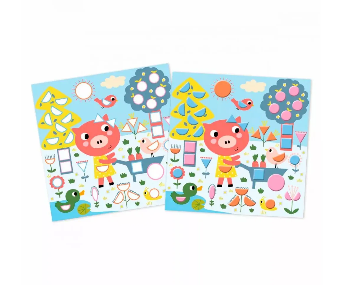 Este creativo kit de pegatinas cuenta con 4 cuadros para decorar con pegatinas geométricas de espuma. Es estupendo para que los peques trabajen la motricidad fina.