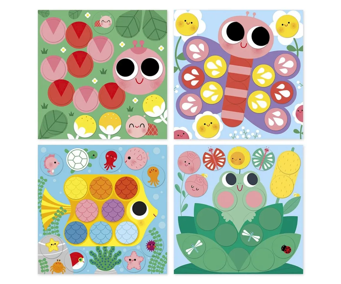 - Incluye: 4 dibujos para decorar(1 rana en su nenúfar, 1 pez en el agua, 1 mariposa, 1 oruga), 4 hojas de pegatinas (72 en total), 1 hoja de instrucciones