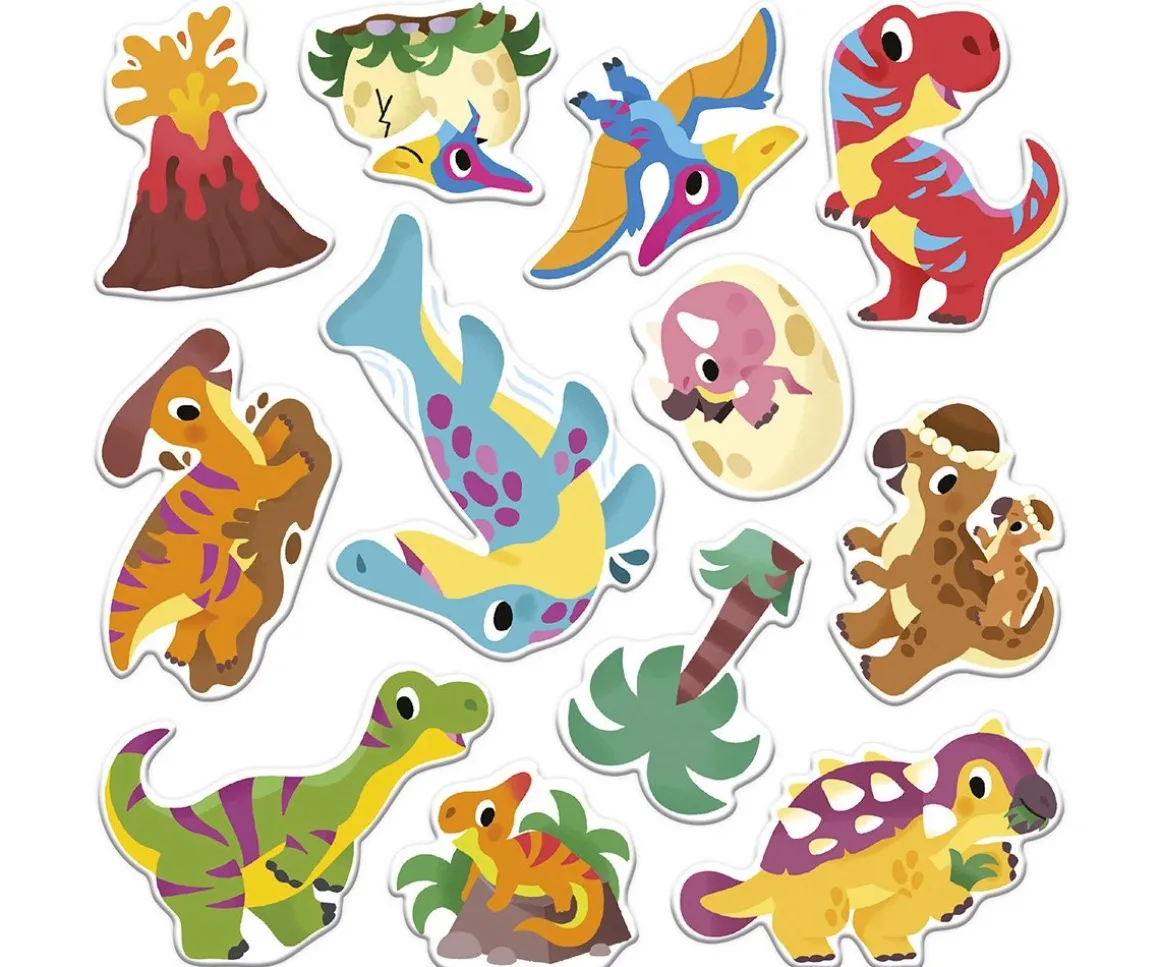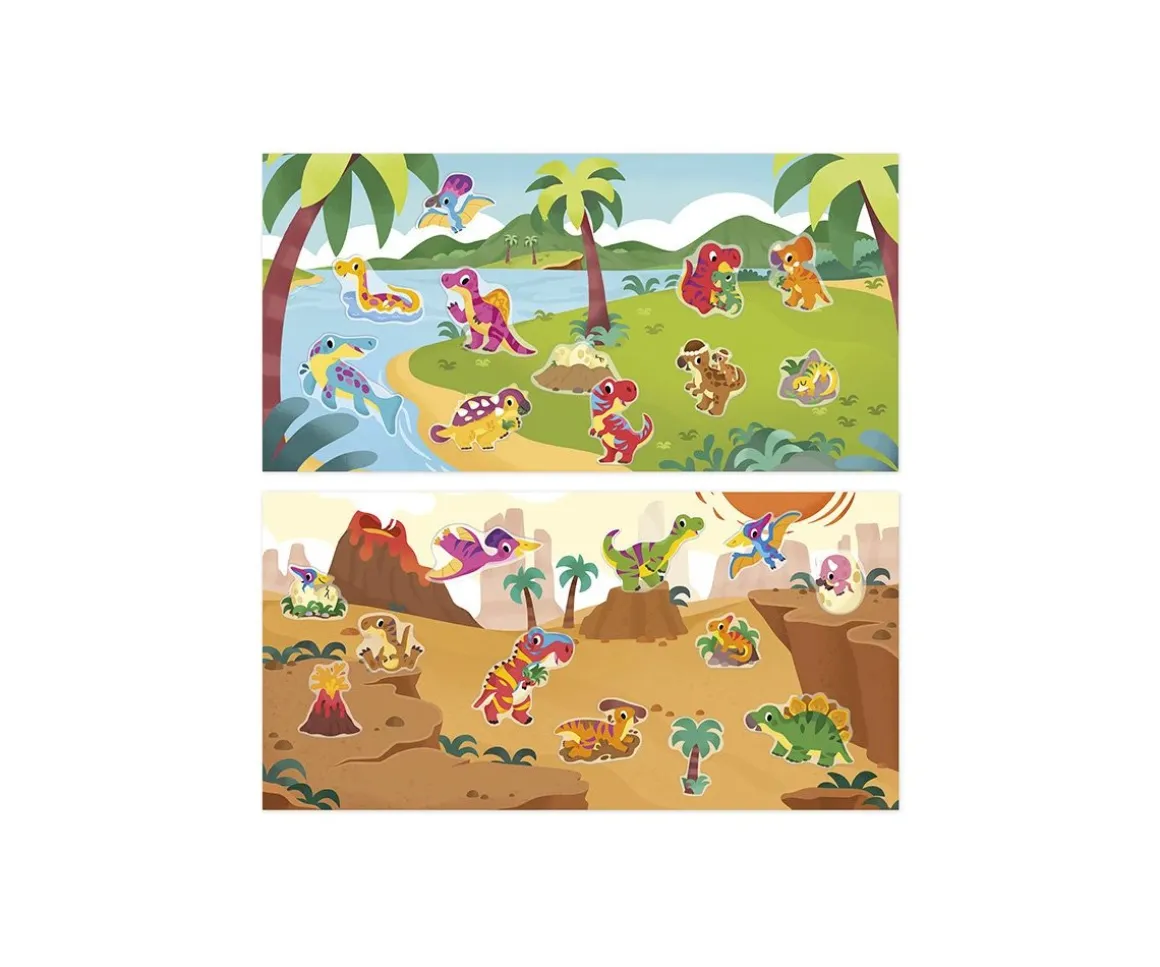 Las pegatinas son reutilizables permitiendo que los niños prueben diferentes combinaciones sin cometer errores permanentes.Sin duda, una manera estupenda de fomentar la motricidad fina, la creatividad y el amor por los dinosaurios!