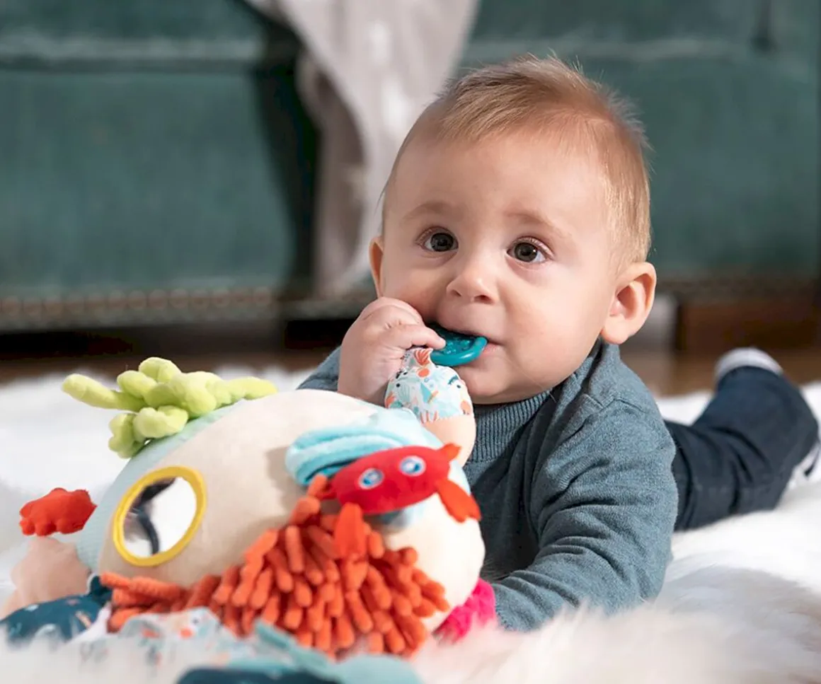 Los peques lo pasarán en grande mirando, tocando, mordiendo y escuchando este arrecife blandito de corales. Se divertirán explorando sus secretos y agitando su sonajero extraíble con forma de bebé pulpo.