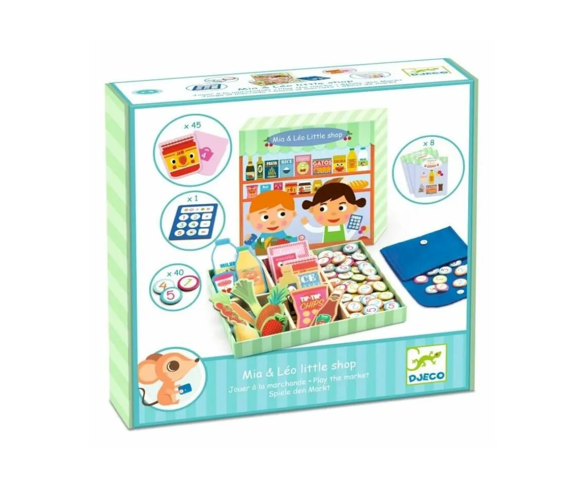Leche, fruta, carne, pescados y mucho más podrás tener en tu propia tienda de alimentación con el juego de imitación Mia&Léo de Djeco.