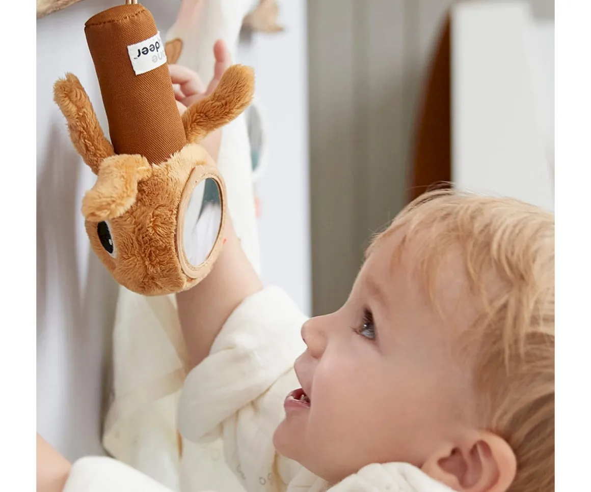 Este sonajero con espejito en forma de medusa siempre esta listo para echarte una mano,¡o siete! El sonido de arrugas que hace al ser apretado hará que despierten los sentidos de tu pequeño mientras juega