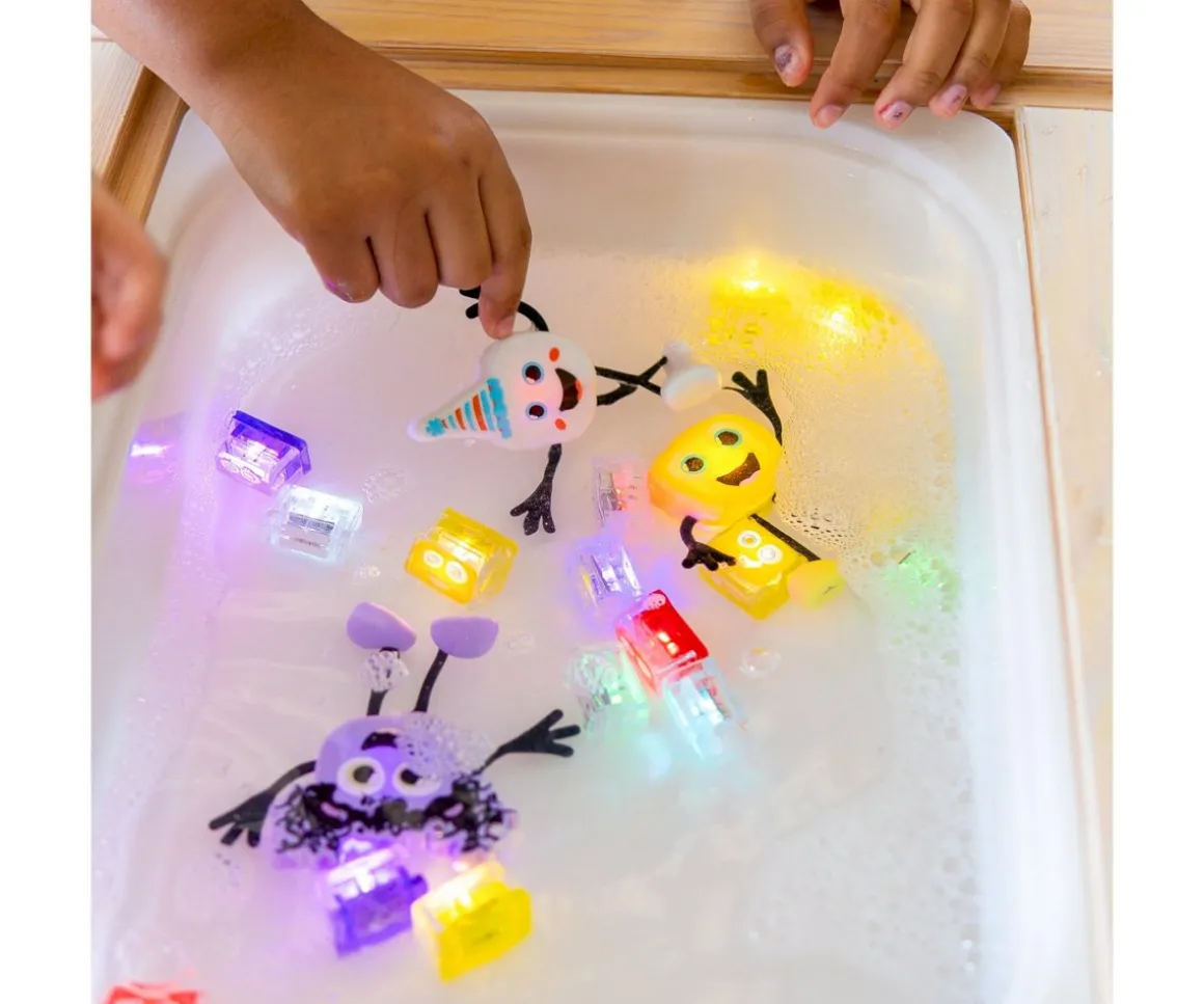 Pal es un personaje multicolor muy divertido que viene acompañado de dos cubos iluminados reutilizables. Los brazos de Pal son flexibles, y puedes insertar los cubos en la parte posterior de Pal, y ver cómo se ilumina en el agua.