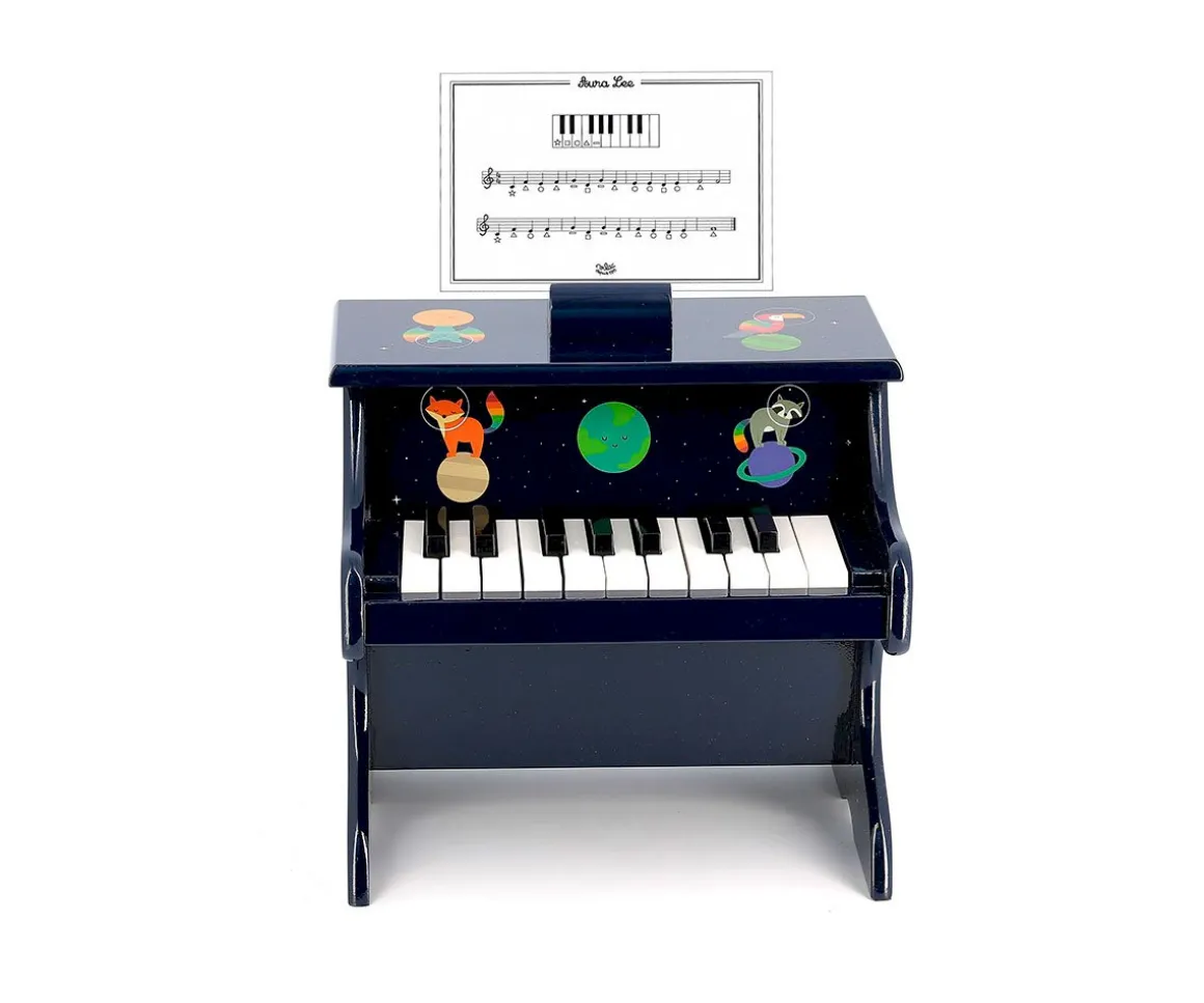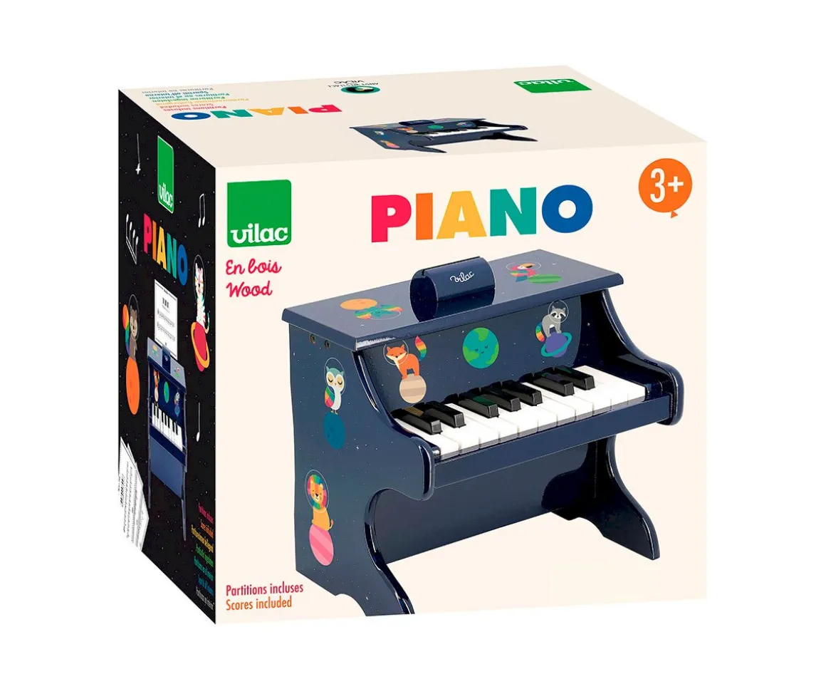 Precioso piano decorado con ilustraciones de Andy Westface con 18 teclas y 10 partituras para enseñar a tu hijo a tocar sus primeras canciones.