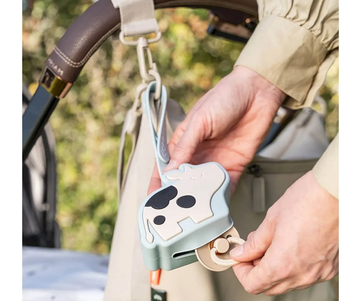 La funda para chupete de la bonita vaca Dotti de la colección de Done by Deer, fabricada en silicona suave, tiene espacio para 2 o 3 chupetes. Con correa ajustable para sujetarlo al cochecito o bolso cambiador, mantiene los chupetes limpios y accesibles.