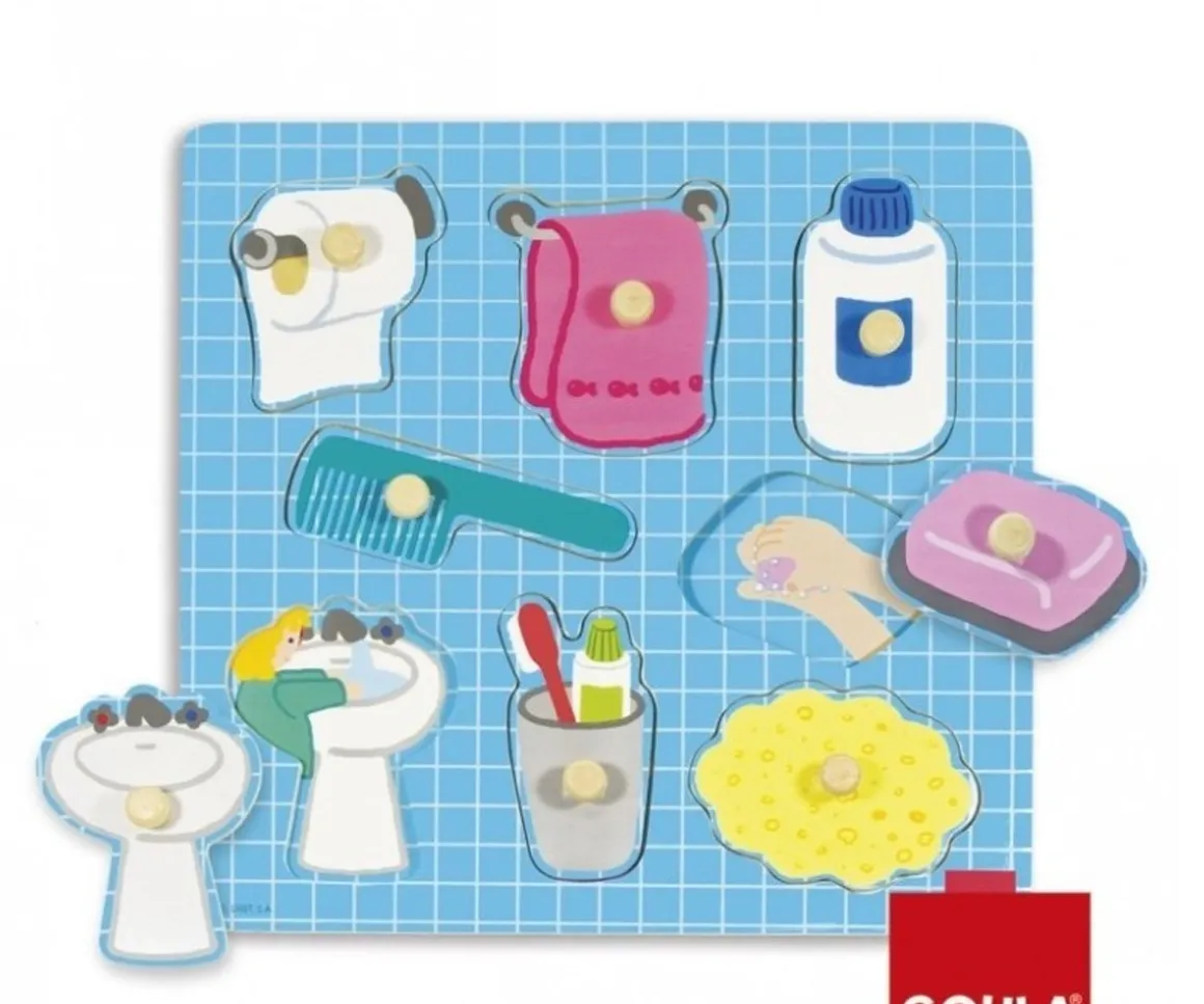 Con este rompecabezas educativo de Goula, los niños descubrirán los diferentes utensilios del baño y aprenderán de forma divertida los hábitos básicos de higiene personal. Cada pieza representa un objeto y su acción correspondiente, ayudando a los pequeños a comprender rutinas como cepillarse los dientes, lavarse las manos o peinarse.