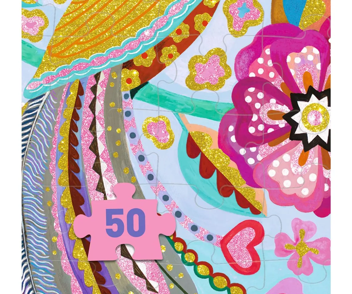 Puzzle compuesto por 50 piezas dónde poder crear la imagen del precioso pavo real con purpurina. Un puzzle con muchos detalles en la imagen y en los colores.