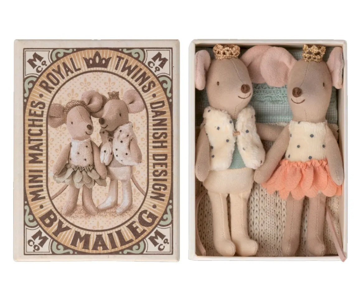 Los ratoncitos reales con corona de oro y plata y hermosa ropa duermen en una bonita caja de cerillas decorada.