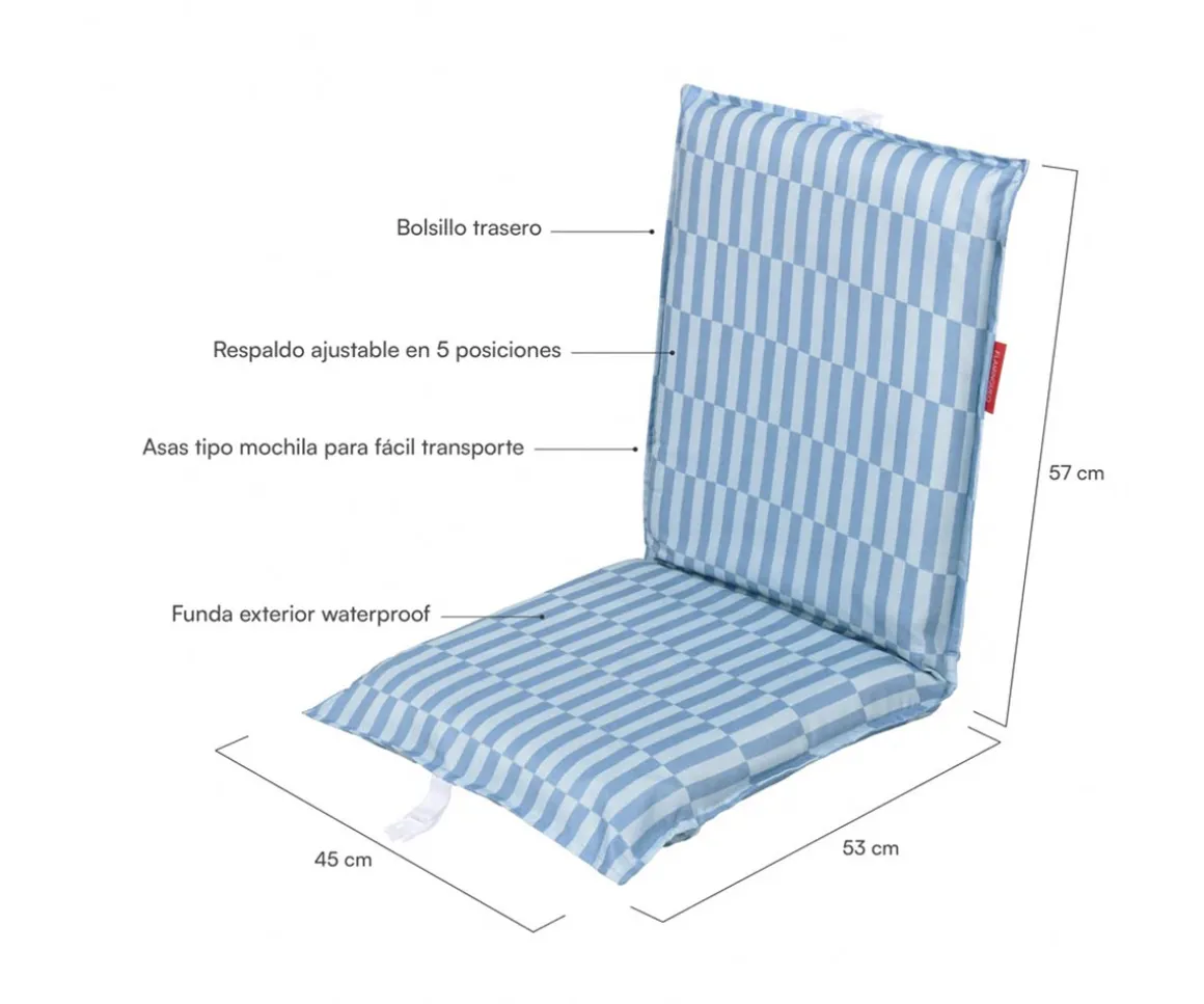 Haz que tus momentos al aire libre sean aún más cómodos con el respaldo estilo silla de playa a rayas azul Blake de Flamingueo. Perfecto para el verano, cuenta con 5 posiciones reclinables para adaptarse a tus necesidades y asas tipo mochila que facilitan su transporte. Ideal para usar en la playa, la piscina o en el jardín.