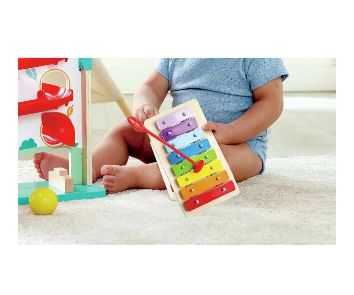 Las bolas caerán por el colorido circuito tocando el xilófono al final del mismo, para los peques será emocionante y muy divertido observar y entender la causa y el efecto. Para que las bolas caigan a través del circuito los peques deberán golpearla con el martillo incluido.