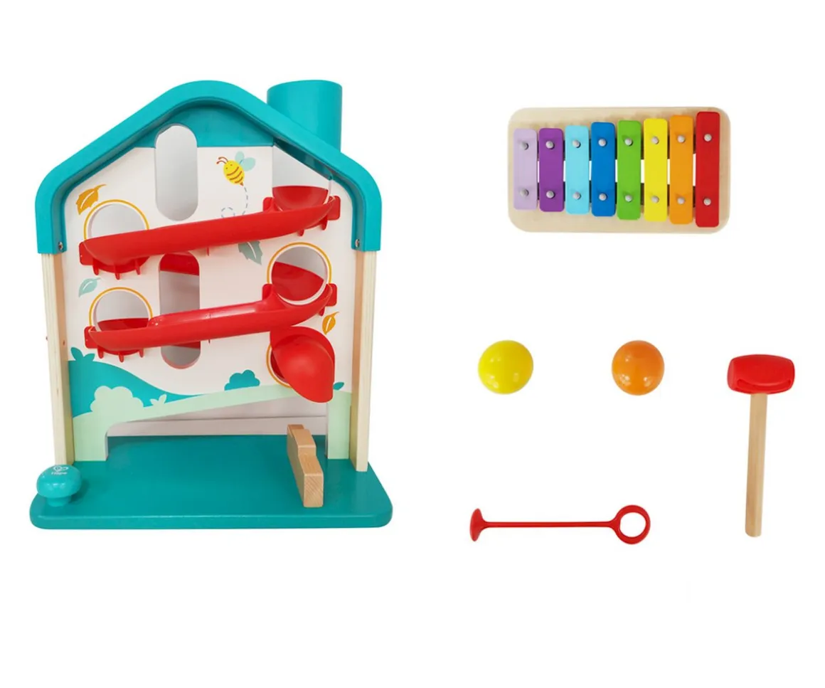 - Incluye: circuito de bolas con xilófono incluido, martillo, varita para tocar el xilófono, 2 bolas