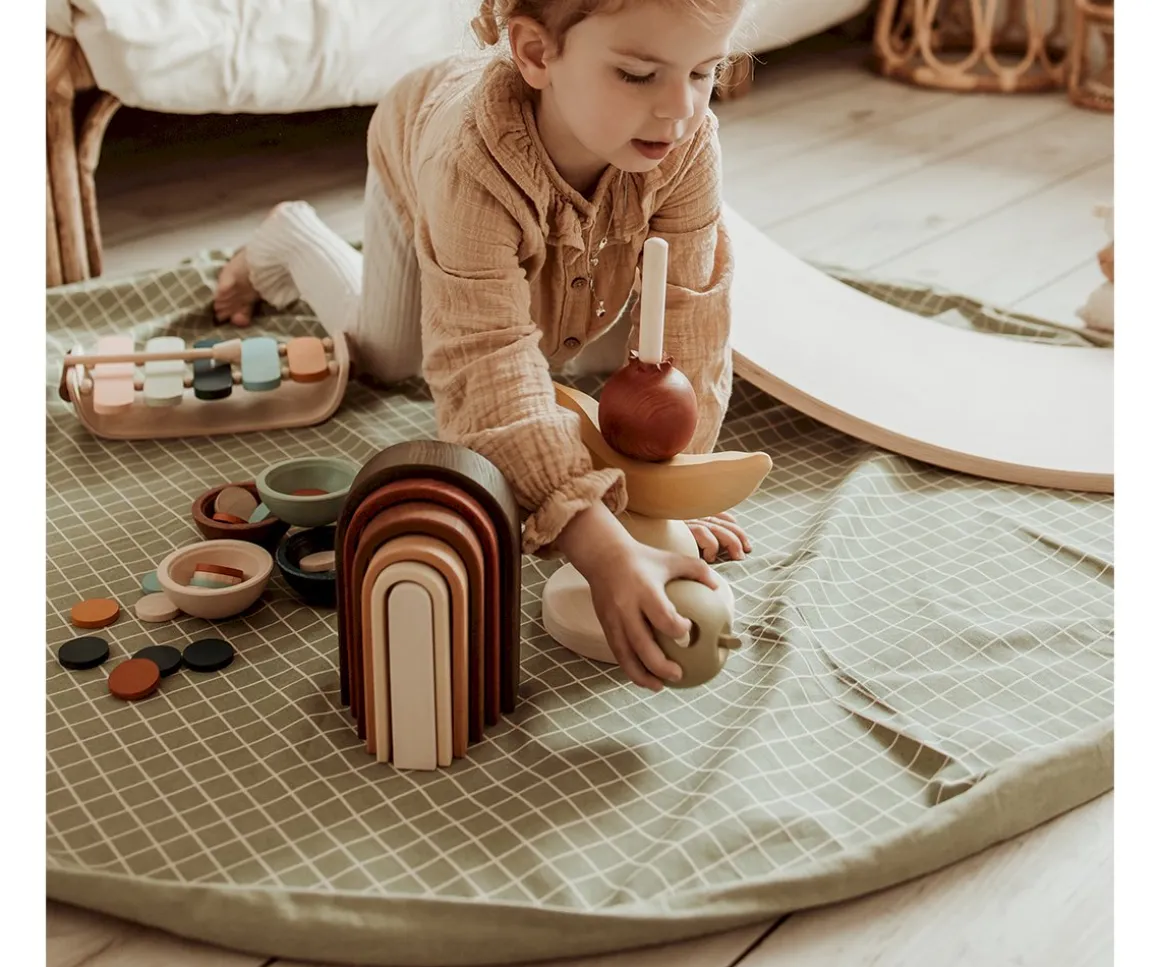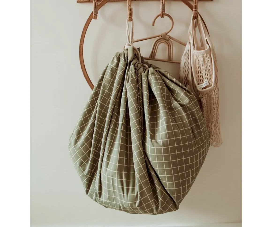 Este saco se desdobla y se convierte en una manta de juegos donde el niño puede jugar con todas sus juguetes, grandes y pequeños, y cuando llega la hora de acostarse, sólo hay que cerrarla y ya está todo recogido.