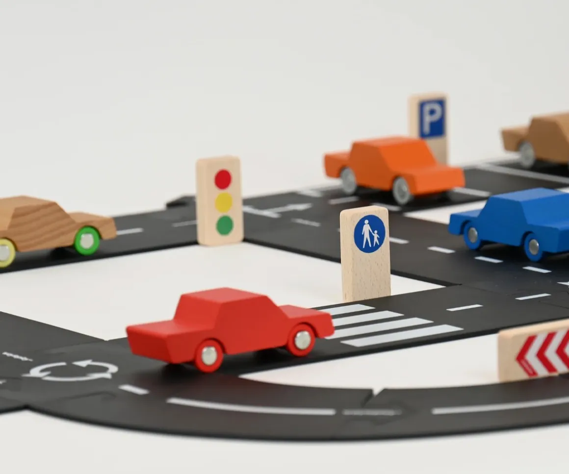 El set de Waytoplay incluye 8 señales de tráfico de madera diseñadas especialmente para complementar los circuitos de carreteras flexibles de la marca que puedes encontrar