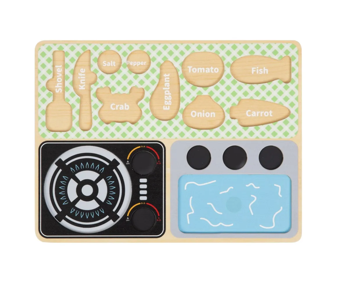 - Incluye: 1 base de madera, 6 ingredientes de madera que se unen mediante velcro,tabla de madera, cuchilo, pala, salero, pimentero, sartén