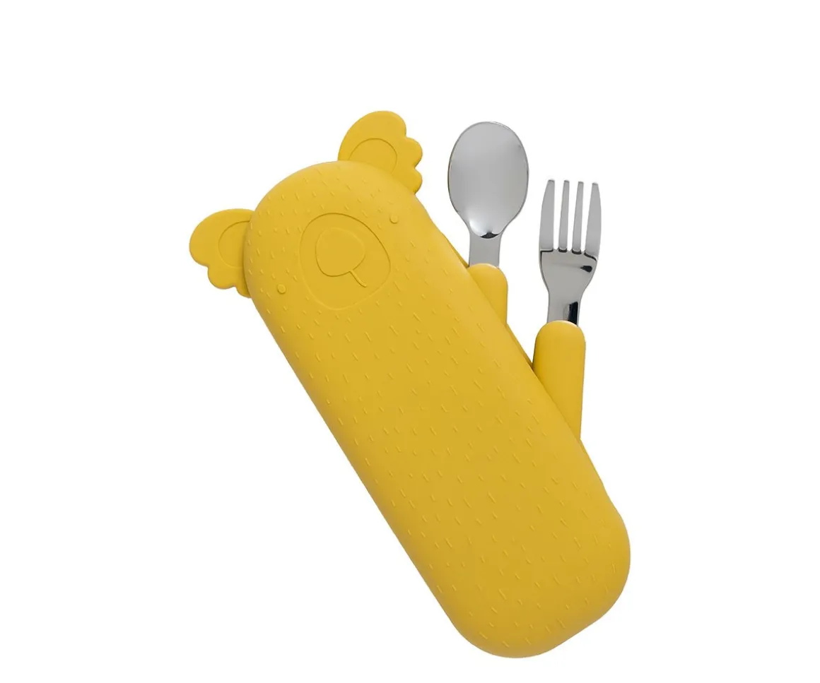 Set de cubiertos de The Cotton Cloud, perfectos para el momento de la comida de los más peques. La funda de silicona que incluye ayuda a mantener los cubiertos limpios y seguros.
