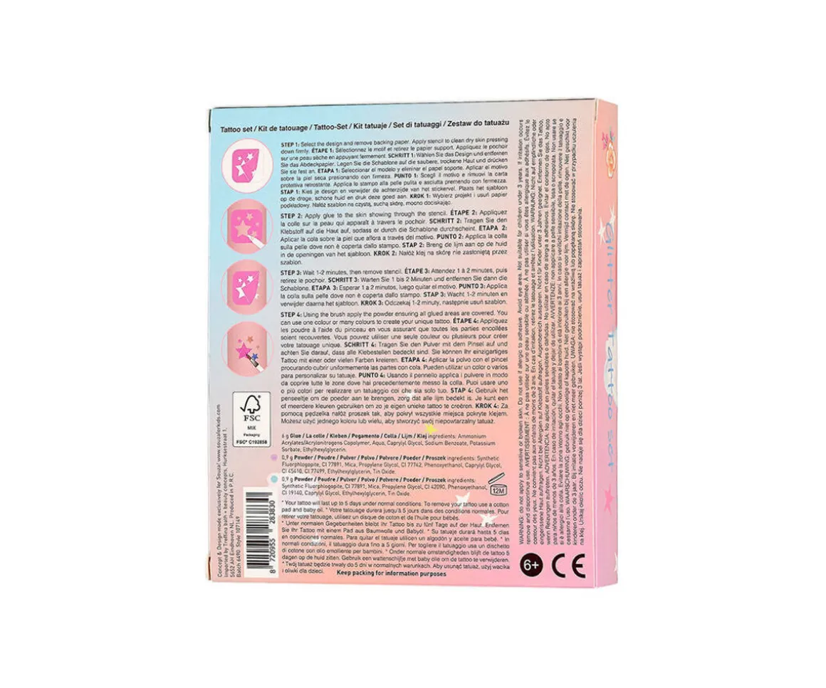 Convierte cualquier día en una experiencia mágica con el set de tatuajes de purpurina Souza. Este set permite crear tatuajes temporales brillantes de manera segura y divertida, inspirados en unicornio, arcoíris y corona.