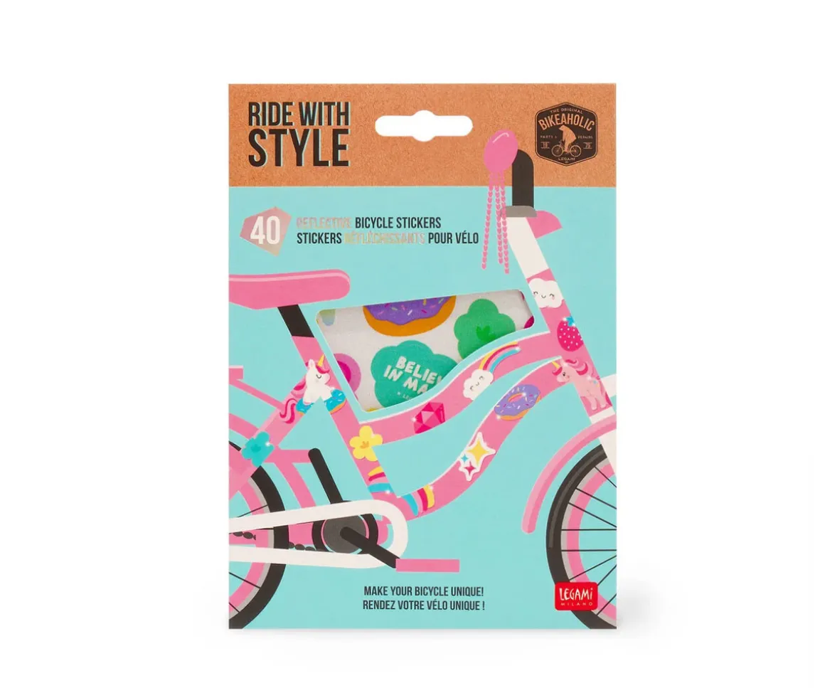 Las Pegatinas Reflectantes para Bicicleta Ride With Style Unicorn de Legami son ideales para personalizar tu bici y aumentar tu visibilidad durante tus paseos. Gracias a su acabado fluorescente, estas pegatinas no solo aportan un toque divertido y mágico con su temática de unicornios, sino que también mejoran la seguridad en condiciones de poca luz.