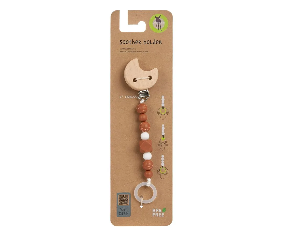 El sujetachupetes LÄSSIG de la colección Little Universe mantiene el chupete siempre a mano. Con un clip de madera, cadena y anillo de silicona, es seguro y fácil de sujetar a la ropa.