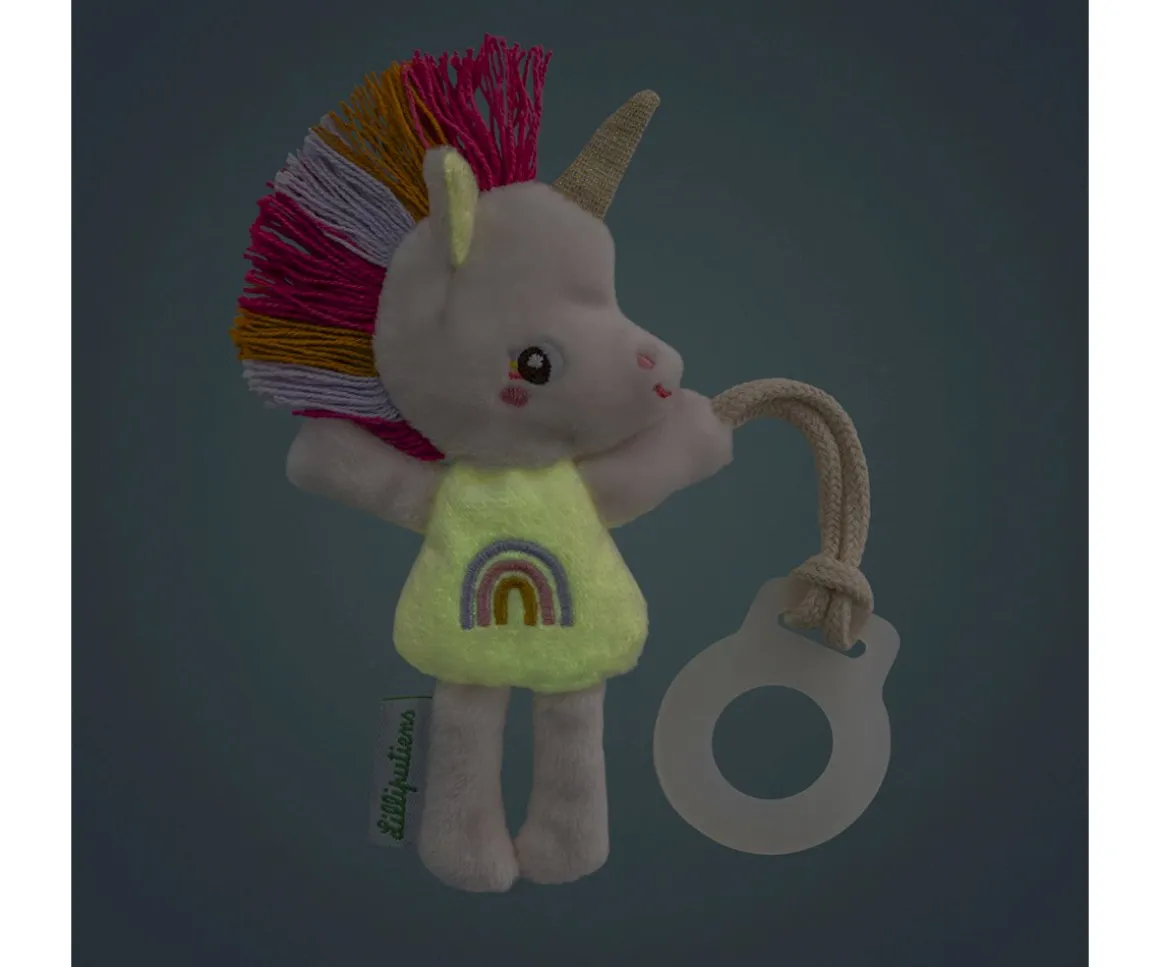 Lena, el unicornio de Lilliputiens es un mini peluche de lo más adorable que incluye sujeción para el chupete del bebé. Por la noche brillará para que al peque le resulte más fácil encontrar su chupete.