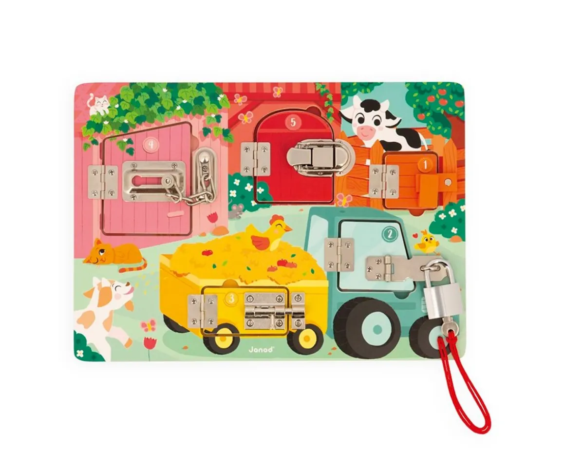 Cerraduras, cerrojos, llaves… Deja que tu peque disfrute descubriendo, pensando y experimentando con los animales de la granja en su propio tablero de cerraduras. Para descubrir todos los secretos de este bonito tablero de madera, habrá que conseguir abrir las cinco puertas cerradas con cinco sistemas distintos: ¡llave, pestillo, cadena de seguridad, cierre de palanca y cerrojo! Cada puerta tiene su propio color y su propio número, ¡que se corresponde con el número de crías de animales que se esconden tras la puerta! ¡Un montón de formas distintas de divertirse! Ayuda a que tu peque aprenda los colores, los números, los animales de la granja y a ejercitar la destreza y la lógica.